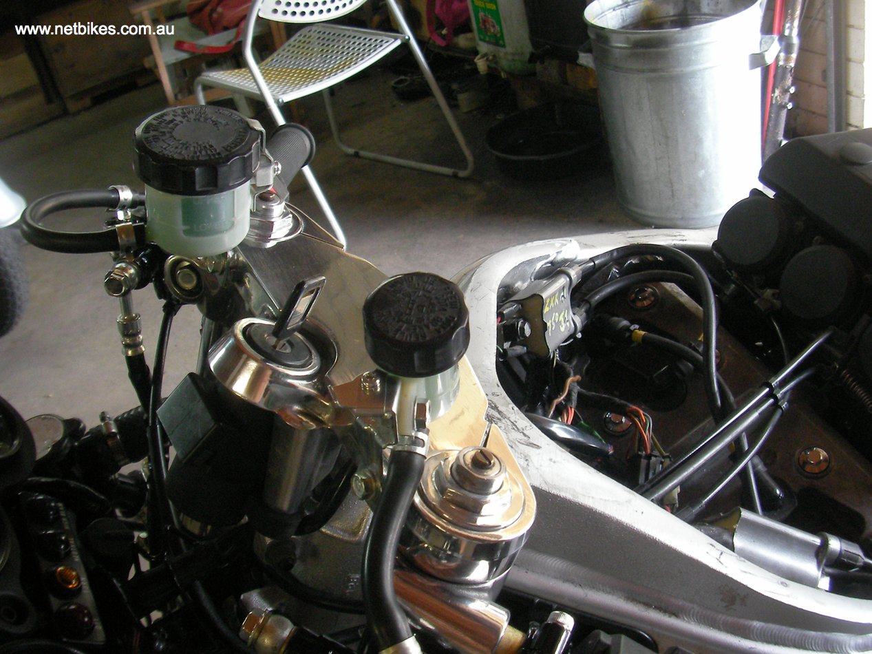 I have now assembled the forks with new seals, bushes and dust caps, filled with oil to the recommended level, 135mm from the top of the tube with spring removed, I measured the oil as I was doing it and each leg holds 380cc, (ml). The recommended weight is 5 so I used ATF which is 8. Fitted the front wheel and callipers, polished and fit the top alloy clamp, handle bars, switch blocks and levers with master cylinders and bled them up. Not much more to go now.