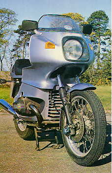 Internally, the obvious improvement over the 100's predecessor, the R90S, is the extra capacity, which boosts the total displacement to 980cc. In RS trim, the flat-twin unit produces 70bhp at 7250rpm and an impressive 55.71b ft at 5500rpm. More importantly. the torque curve is particularly flat over a large part of the rev range. On the road, this means that acceleration is smooth and quick and virtually constant. whereas a large two-stroke bike, such as the Kawasaki 750. with a 'peaky' engine, will have almost negative acceleration should the engine speed drop below a very narrow and critical range. The BMW. however, is a high-speed tourer and is not designed for race-style getaways, even though its sub-14-second standing-start quarter-mile time is quick by any standards. The high, 5001b machine takes some getting used to. especially when negotiating town traffic, its weight and considerable proportions making progress more of the 'follow the stream' kind rather than 'find the gap.' Blipping the throttle at a standstill produces the famous BMW trait of the torque reaction tipping the bike to the rider's right. Any time the bike does tip to an angle of more than a few degrees, one has a struggle to keep it upright, the fairly high seat not helping things, especially if one is shorter than 5ft lOin. Once on the move, however, one quickly forgets about the weight and the movement and the machine is transformed into an extremely smooth and efficient tourer. Acceleration is totally drama free: the power is put down exceedingly well and there is absolutely no hint of control loss, even when blistering away slipping the delightfully light clutch. The gearchange is far better than on previous machines although it still suffers from the 'shaft-drive clunk'. Two large, cross-drilled discs at the front stop the bike well in any weather, but the large rear drum seems less efficient. As for the handling, one does not throw a big BMW around, it just corners well on its own. Even at very high speeds, the machine banks over without any of the fuss and twichiness that plagues machines of lesser breeding. It is when one is travelling at speed that the fairing is noticed: crouching slightly is all that is needed to keep out of the airstream and there is hardley any trace of turbulence at all. In fact, when it is raining the rider should keep completely dry as long as the speed is kept above, say, 25mph. Accentuating its touring capabilities the bike can return up to 50mpg and, with a 5 1/2 gallon fuel tank, gives a possible range of over 260 miles between refills. However, two up touring on the banana sports seat is out except for the very closest of friends, perhaps the optional dual seat is the better proposition. |