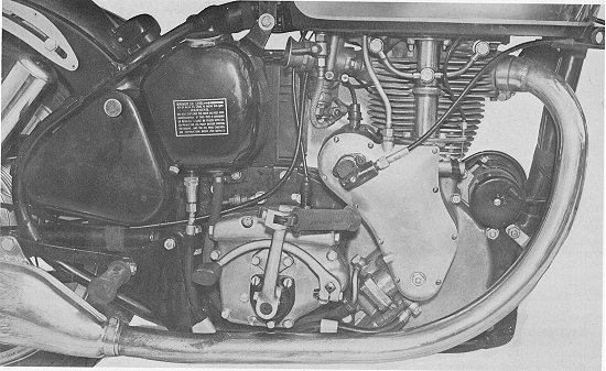 In the form tested the machine was in what is generally known as "Clubman's" trim, having a host of optional extras, including light-alloy wheel rims, manually controlled BT-H magneto, Amal TT-type carburettor, rev counter, rearward-mounted footrests, special exhaust pipe and silencer and extra-close "TT" gear ratios. With the extra power available it proved completely practical to pull a top gear of 4.4:1, obtained by fitting a gearbox sprocket having 20 instead of a standard 18, teeth. Bottom gear on this set-up was 8.7:1 - decidedly high but by no means impractical. When driving in town traffic the clutch could be gently fed in and, once under way, upward changes made at engine speeds of about 2,500 rpm. In top the model would "plonk" along quite happily on a whiff of gas on about 2,000 rpm. The exhaust pipe and carburettor tended to "fight" at 2,900-3,100 rpm with some consequent eight-stroking but it was easy to drive straight through this extremely narrow band. Once over that rate of rpm the power came in steadily up to the peak figure of just over 6,000 rpm. Town progress at the 2,000-rpm mark was of the order known as "gentlemanly," with a steady, dull beat coming from the silencer and only the faintest of mechanical taps - a trace of slap from the sports-type piston - from the engine. No noticeable noise came from tappets, timing gears or gearbox at any speed or in any gear. |
